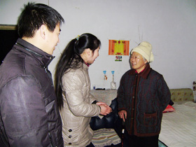 慰问组一行人来到许家村许双良的母亲家。这位老人非常热情又要沏茶拿糖。慰问组详细询问和查看他们的家庭生活情况,了解家中的经济现状。刘树春经理把礼品送到老人手里,老人激动的道谢给领导问好。临走时安全部长王建恩祝福老人过一个欢乐祥和的春节。
