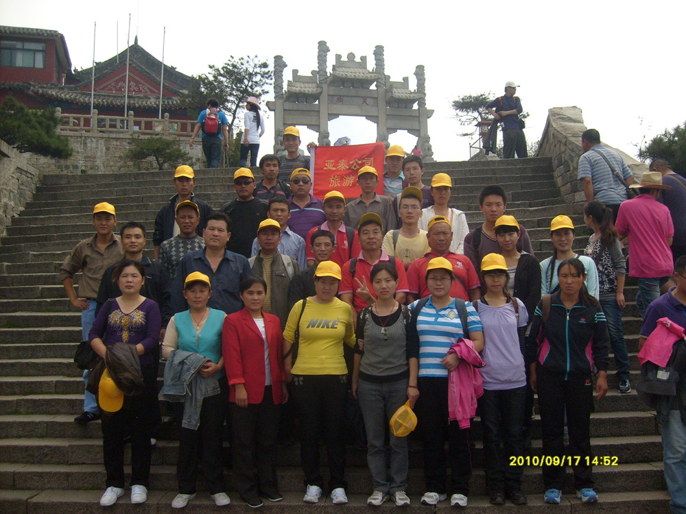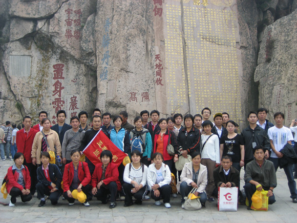 每年组织干部、职工外出旅游,这是登泰山的照片: