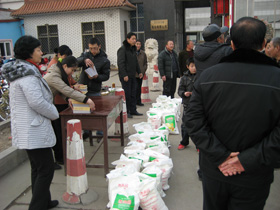 公司董事长高庆山、总经理张兰菊来到锣鼓手中间表示热烈的欢迎并鞠躬表示衷心的感谢,表示公司的发展壮大离不开父老乡亲的支持,离不开职工家属的配合。公司发展了,会更大的回报社会、回报乡亲。他们的深情也迎来了锣鼓团阵阵激烈的掌声,形成了互相感恩的氛围。总经理立即安排专门人员沏茶倒水热情招待,安排车辆买回了80多袋饺子粉,每人一袋送给他们,并送给他们每人一本《弟子规》希望在弟子规的引导下,带动四周百姓和睦乡里,构建更加和谐的社会。